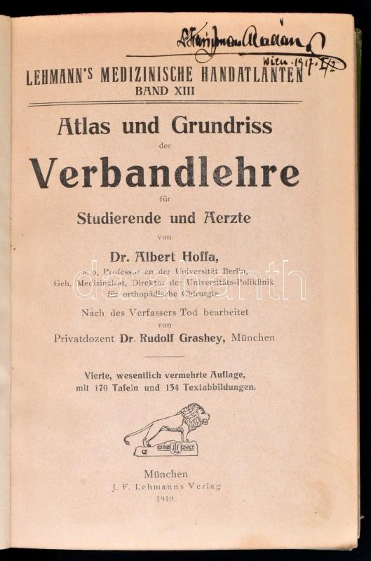 Dr. Albert Hoffa - Dr. Rudolf Grashey: Atlas und Grundriss Verabandlehre für Studierende und Aerzte. Lehmann's Medizinische Handatlanten XIII. München, 1910, J. F. Lehmanns. Negyedik kiadás. Kiadói aranyozott egészvászon. Számos képpel illusztrálva. Német nyelvű egészségügyi tankönyv. / Linen binding, with lot of illustrations, fourth edition, in german language.
