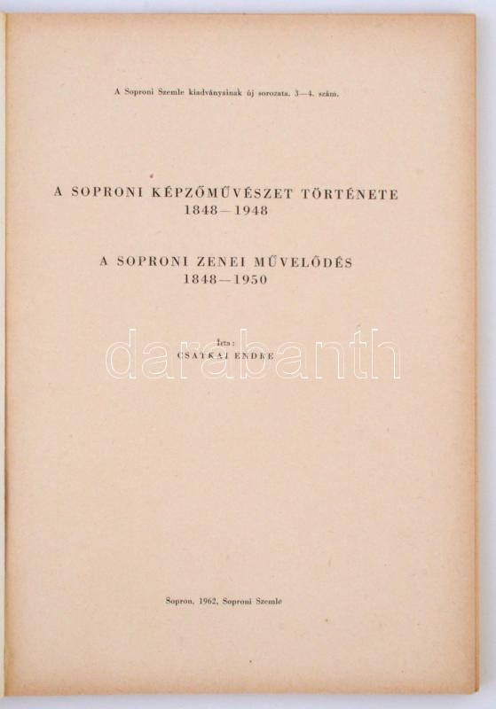 Csatkai Endre: A soproni képzőművészet és zenei művelődés története 1848-1948. Sopron, 1962, Soproni Szemle. Kiadói papírborítóban, fekete-fehér fotókkal illusztrálva.