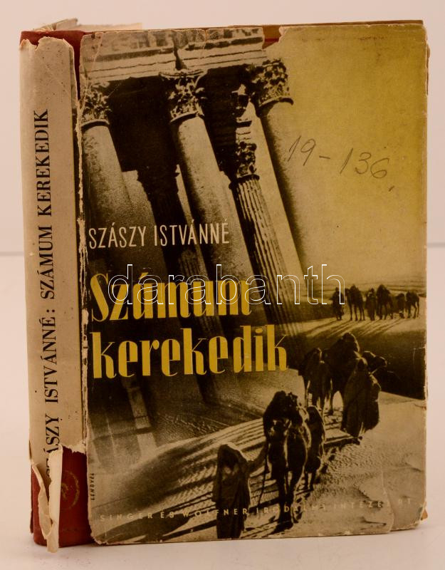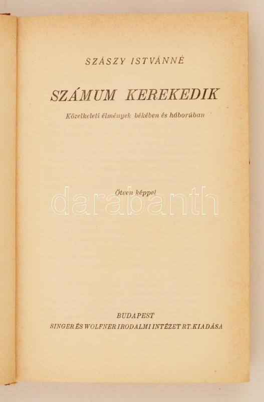 Szászy Istvánné: Számum kerekedik. Közelkeleti élmények békében, és háborúban. Budapest, é.n., Singer és Wolfner Irodalmi Intézet Rt., 188 p. Kiadói félvászon kiadói szakadozott papírborítóban.