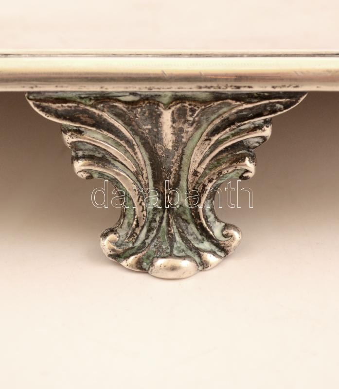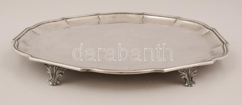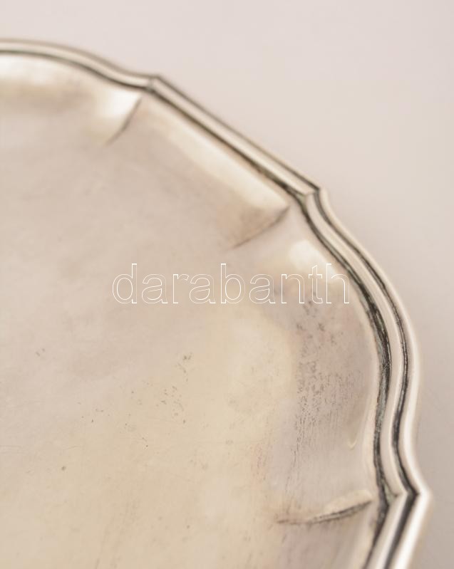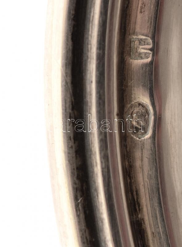 Leírás: Ezüst (Ag.) talpas tálca, jelzett, kalapált, mesterjeggyel (T), d:32 cm, nettó: 928 g