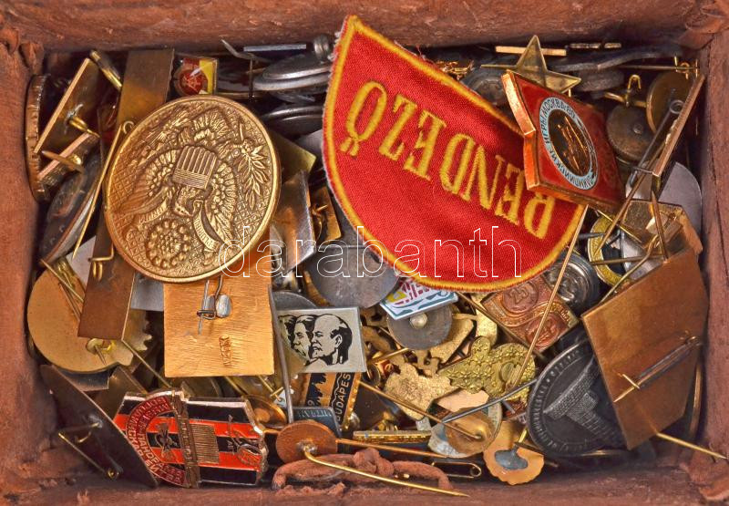 Leírás: Vegyes jelvény és kitűző tétel, magyar és külföldi darabokkal sok túrajelvénnyel, bőr ládikában, közte DN "Magyar Természetbarát Szövetség" (3x), DN "Camping Club", 1951. "Vasas Izzó SK" fém kitűző, 1987. "Budapesti Természetbarát Szövetség", 1973. "Csepel SC 1873-1973" T:vegyes