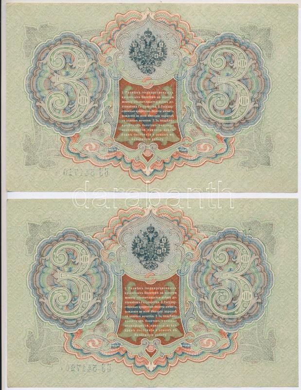 Russian Empire 1912-1917. (1905) 3 Rubles (2x) sequential serials. Sign.: Shipov C:XF,VF