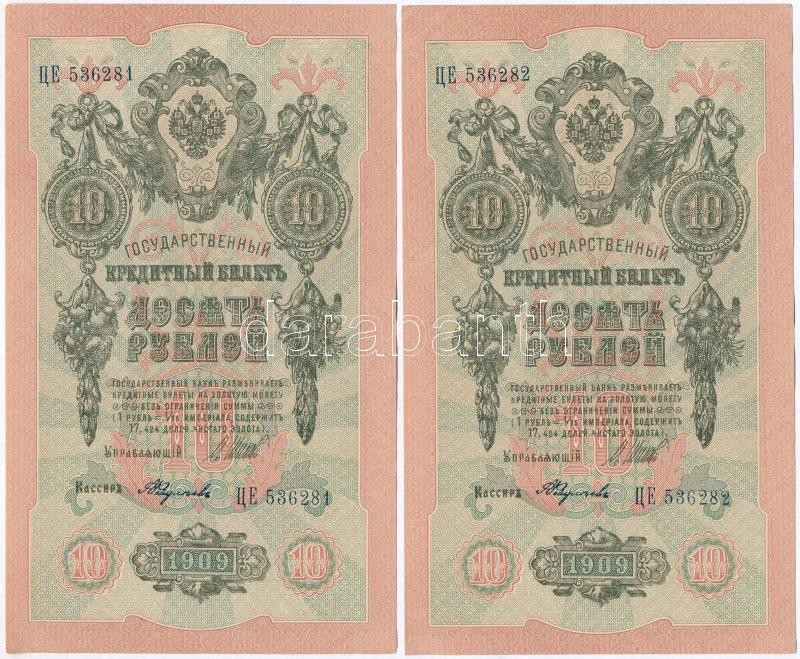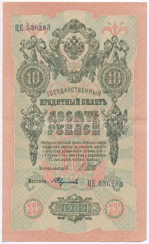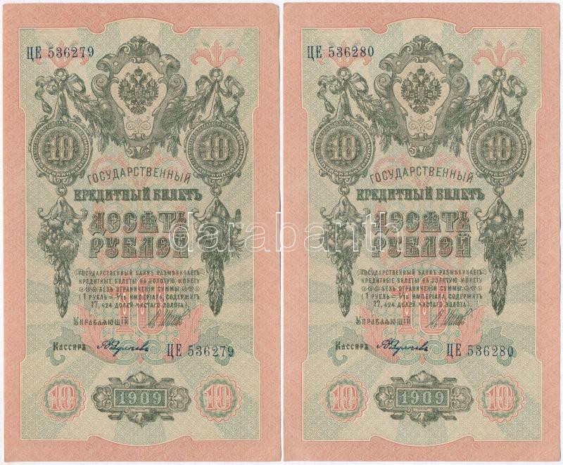 Orosz Birodalom 1912-1917. (1909) 10R (5x) sorszámkövetők. Szign.: Shi... https://www.darabanth.com/hu/281-Gyorsarveres/281.0/Numizmatika/Kulfoldi-bankjegyek~300012/Orosz-Birodalom-1912-1917-1909-10R-5x-sorszamkovetok-Szign-Shipov-TII-II---Russian-Empir~II1451742