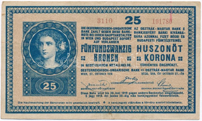 1918. 25K "3110" 3mm, hullámos hátlappal T:III https://www.darabanth.com/hu/281-Gyorsarveres/281.0/Numizmatika/Magyar-bankjegyek~300007/1918-25K-3110-3mm-hullamos-hatlappal-TIII~II1448627