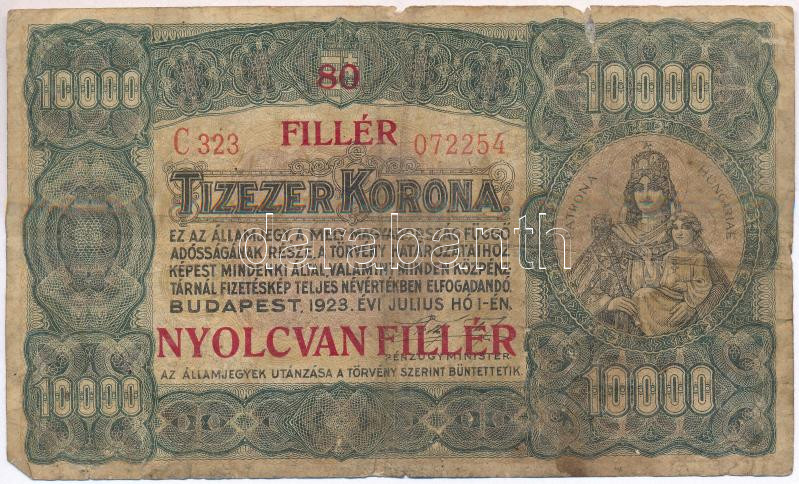 1923. 10.000K "80 FILLÉR - NYOLCVAN FILLÉR" felülbélyegzésse... https://www.darabanth.com/hu/281-Gyorsarveres/281.0/Numizmatika/Magyar-bankjegyek~300007/1923-10000K-80-FILLER--NYOLCVAN-FILLER-felulbelyegzessel-nyomdahely-jeloles-nelkul-T~II1447431