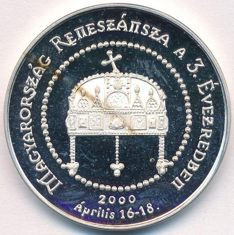 2000. "Magyarország Reneszánsza a 3. Évezredben - 2000. április 16-18. / Magyarország Felemelkedéséért Közhasznú Alapítvány" jelzett Ag emlékérem (33,83g/0.925/42,5mm) T:PP ujjlenyomatos, kis patina