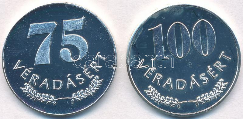 Leírás: DN "Véradásért / Magyar Vöröskereszt" (2xklf) 75 és 100 véradásért, fém emlékérmek eredeti tokban (32mm) T:PP enyhe felületi karc