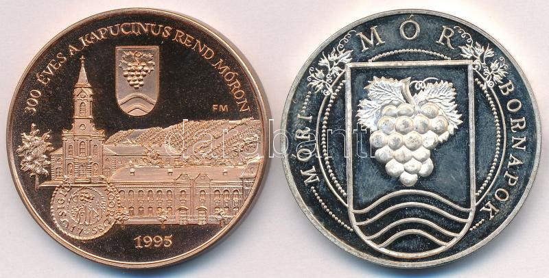 Fritz Mihály (1947-) 1995. "300 éves a Kapucinus Rend Móron / Brindizi Szent Lőrinc török elleni győztes csatája - Csókakővár" Br emlékérem (42,5mm) + Füz Veronika (1951-) DN "Móri Bornapok" fém emlékérem (42,5mm) T:PP ujjlenyomat, patina