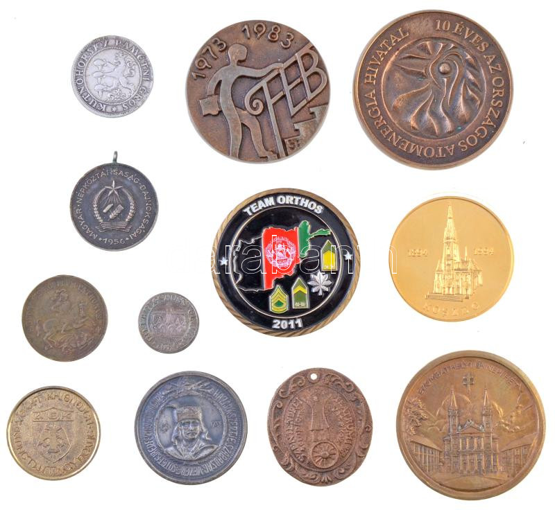Leírás: Vegyes 17db-os emlékérem tétel, magyar és külföldi darabokkal, közte 1934. "Szombathelyi Ünnepi Hét" Br emlékérem (50,5mm), 2001. "10 éves az Országos Atomenergia Hivatal" Br emlékérem (55mm), DN "Pro Universitate Érdemérem / Gödöllői Agrártudományi Egyetem" aranyozott fém emlékérem, műanyag tokban, 2011. "Team Orthos / OMLT 1/6 - 209/2/3 Ana Kandak" fém katonai emlékérem (50,5mm) T:2,2-