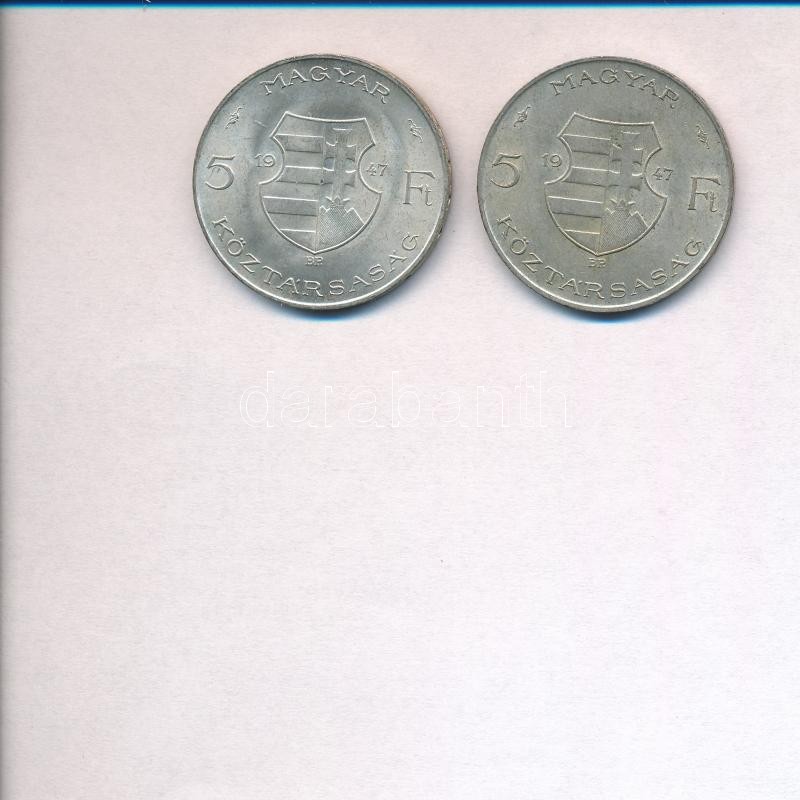 1947. 5Ft Ag "Kossuth" (2x) T:2,2- https://www.darabanth.com/hu/281-Gyorsarveres/281.0/Numizmatika/Magyar-es-magyar-verdejelu-fem-es-ezustpenzek~300008/1947-5Ft-Ag-Kossuth-2x-T2-2-~II1448390