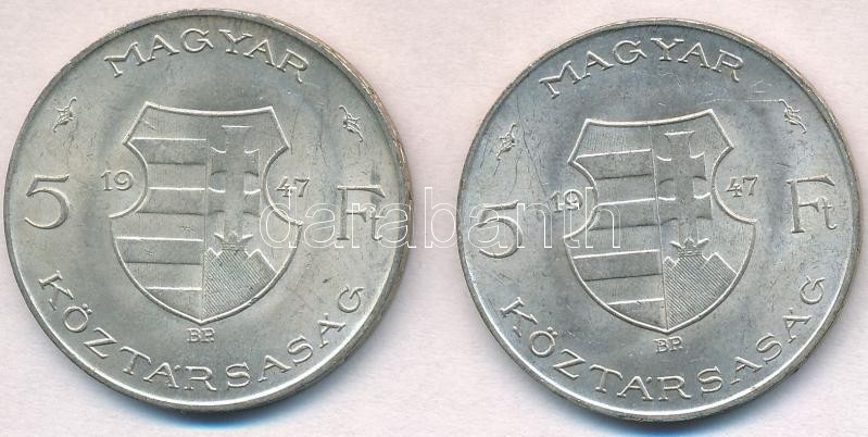 1947. 5Ft Ag "Kossuth" (2x) T:2- ph. https://www.darabanth.com/hu/281-Gyorsarveres/281.0/Numizmatika/Magyar-es-magyar-verdejelu-fem-es-ezustpenzek~300008/1947-5Ft-Ag-Kossuth-2x-T2-ph~II1448367