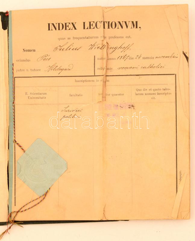 1867 Kir. M. Tudományegyetem Politikatudományi kar leckekönyve számos híres jogász aláírásával. Hajnik, Vécsey, Kerkápoly Károly, Plósz Sándor, Pulszky Ágost, Sághy Gyula.