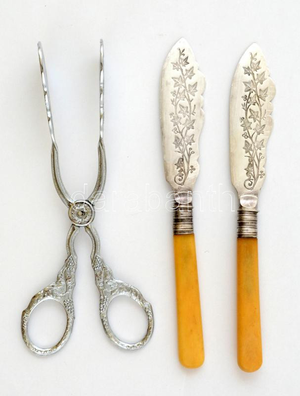 Leírás: 2 db díszes csontnyelű kés + 1 db díszes húsfogó, h: 18,5 cm