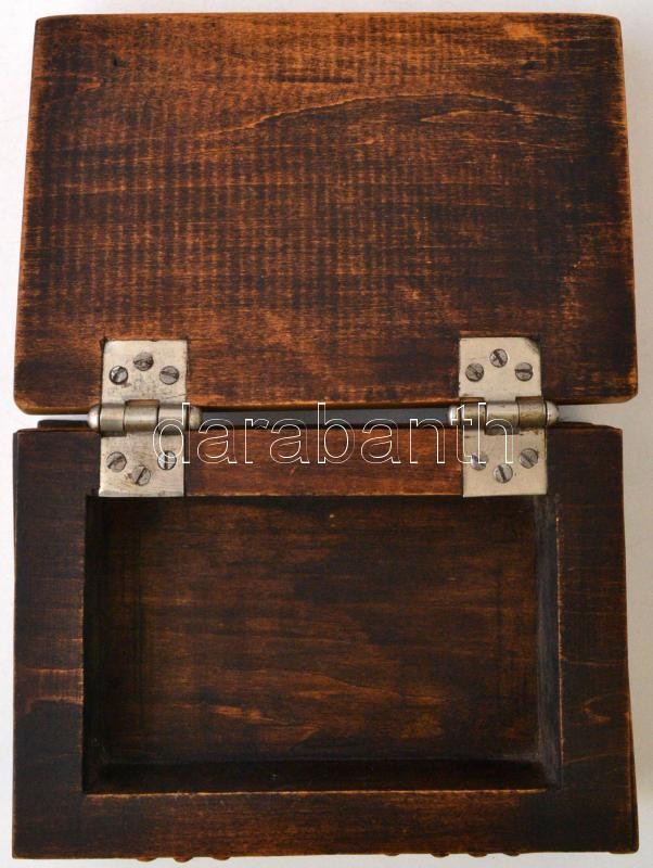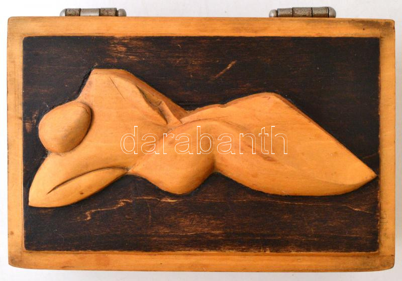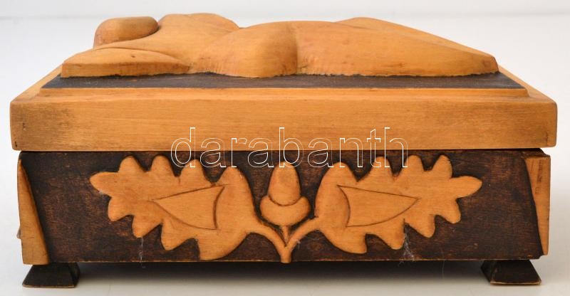 Faragott fa doboz, tetején fekvő alakkal, jó állapotban, 18×12 cm https://www.darabanth.com/hu/282-Gyorsarveres/282.0/Festmeny-mutargy-papirregiseg-egyeb/Bolhapiac~19/Faragott-fa-doboz-tetejen-fekvo-alakkal-jo-allapotban-18C39712-cm~II1406557