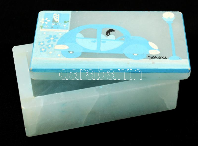 Leírás: Festett alabástrom ékszeres dobozka, jelzett (Jaruska), kopott, 6×3 cm