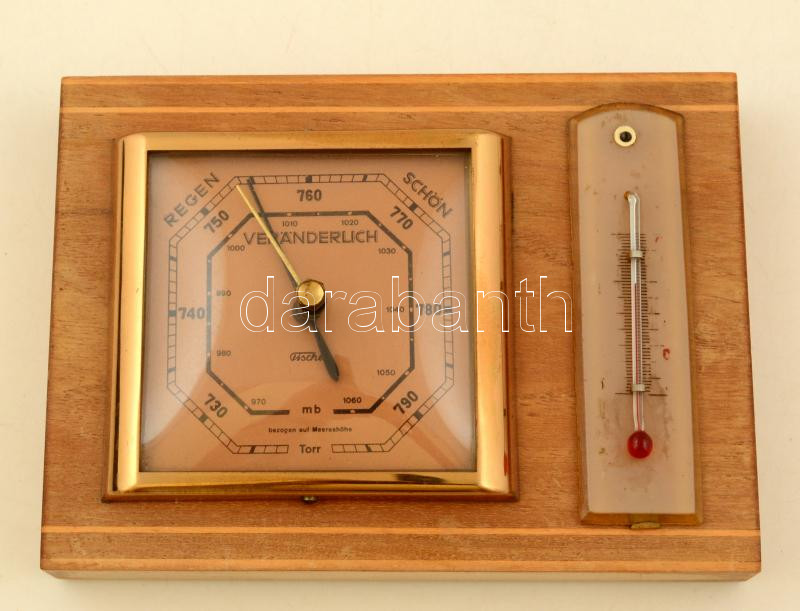 Leírás: Fischer fali barométer és hőmérő, a hőmérő picit mozog a foglaltban, 17x13×3 cm.