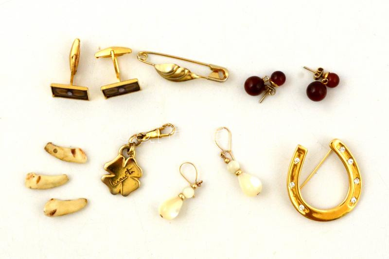 Leírás: Kis bizsu tétel: fülbevalókkal, kitűzőkkel, mandzsettagombbal, 7 db