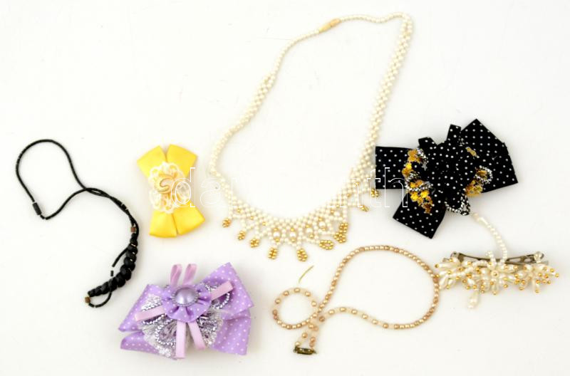 Leírás: Kis bizsu tétel mutatós gyöngy nyakláncokkal(3 db), 4 db színes hajcsattal