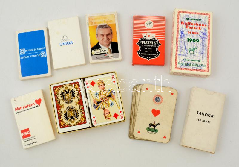 Leírás: Piatnik kártya tétel: 2 pakli tarokk, 4 pakli snapszer, 2 pakli kaiser, egy pakli skat, egy 20 lapos pakli snapszer, adóbélyeggel, összesen: 10 pakli