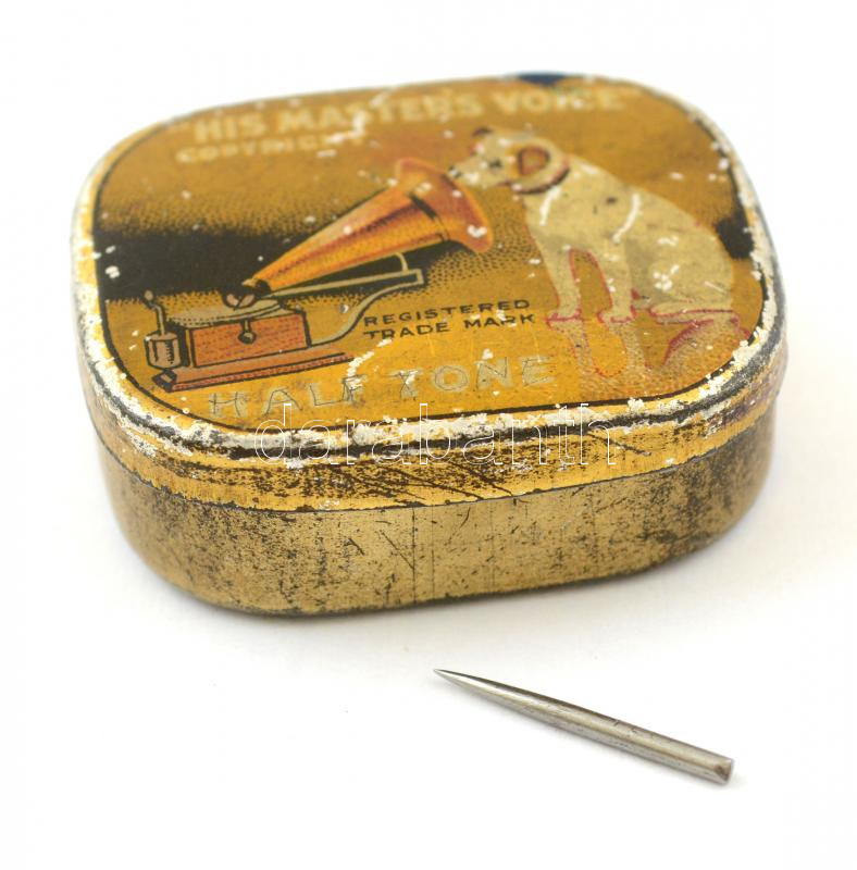Leírás: Régi gramofontűs fém dobozka, tele tűvel, 3,5x4x1,5 cm