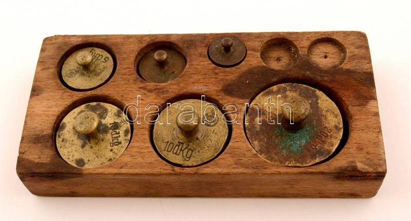 Leírás: Régi hiányos súlykészlet (6db), fedél nélküli fa tokban, 14×7 cm