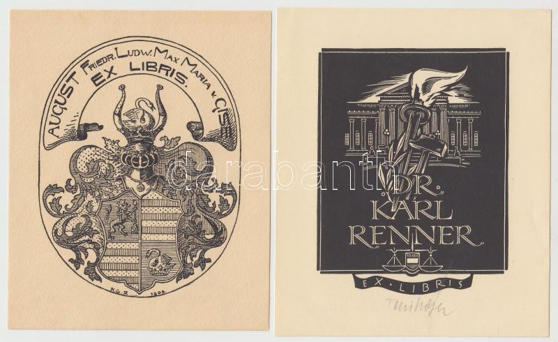Leírás: 3 db külföldi ex libris (Gise Hohenlohe, Toni Hofer, Ottohans Baier), klisé/fametszet/rézkarc, jelzettek, egy csak a klisén, különböző méretben