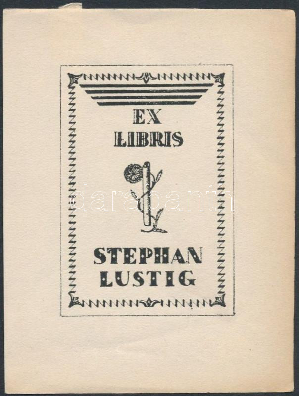 Leírás: Kozma Lajos (1884-1948): Ex libris Stephan Lustig. Klisé, papír, jelzés nélkül, 5,5×4 cm