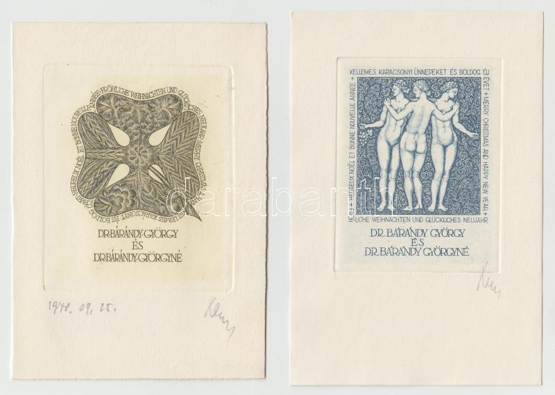 Nagy Árpád Dániel (1922-1985): 2 db alkalmi grafika Bárándy György ügy... https://www.darabanth.com/hu/282-Gyorsarveres/282.0/Festmeny-mutargy-papirregiseg-egyeb/Ex-libris-es-kisgrafika~4/Nagy-Arpad-Daniel-1922-1985-2-db-alkalmi-grafika-Barandy-Gyorgy-ugyved-reszere-rezkar~II1459945