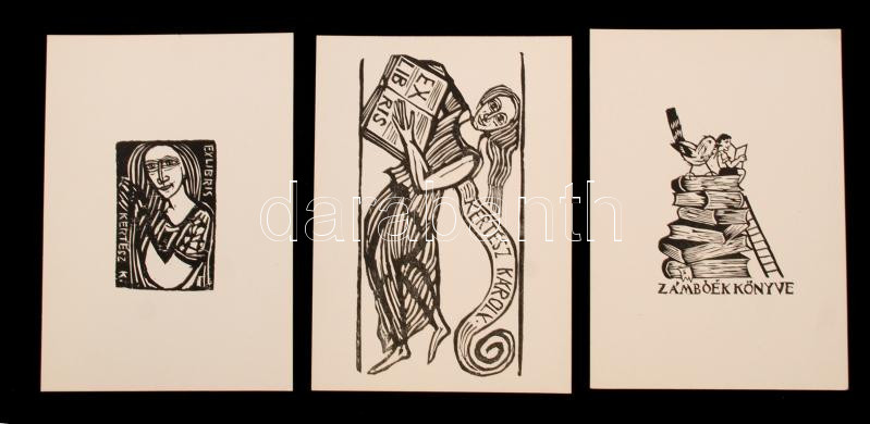 Perei Zoltán (1913-1992) : Vegyes ex libris tétel, fametszet, linó, 2db papír, különböző méretben, 10x15cm; Sólyom Sándor (1943-): Ex libris, linó, dúcon jelzett, papír, 8x6cm