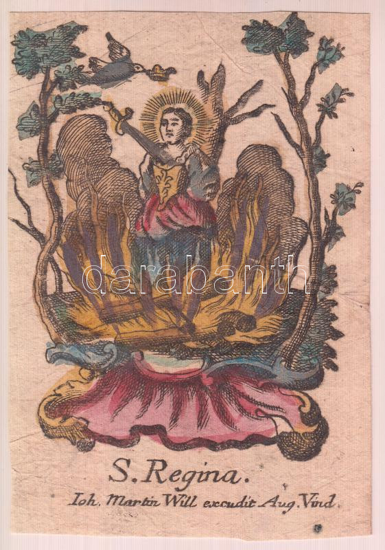 Leírás: cca 1750-1800 Szent Regina, kézzel színezett rézmetszet, 10x7 cm.