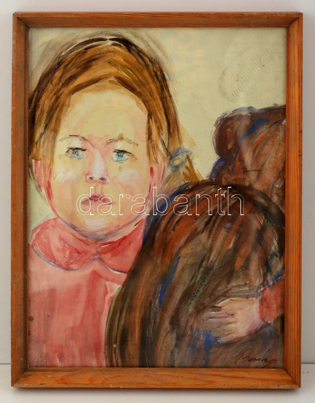 Leírás: Berény jelzéssel: Kislány macival. Akvarell, papír, üvegezett keretben, 40×30 cm