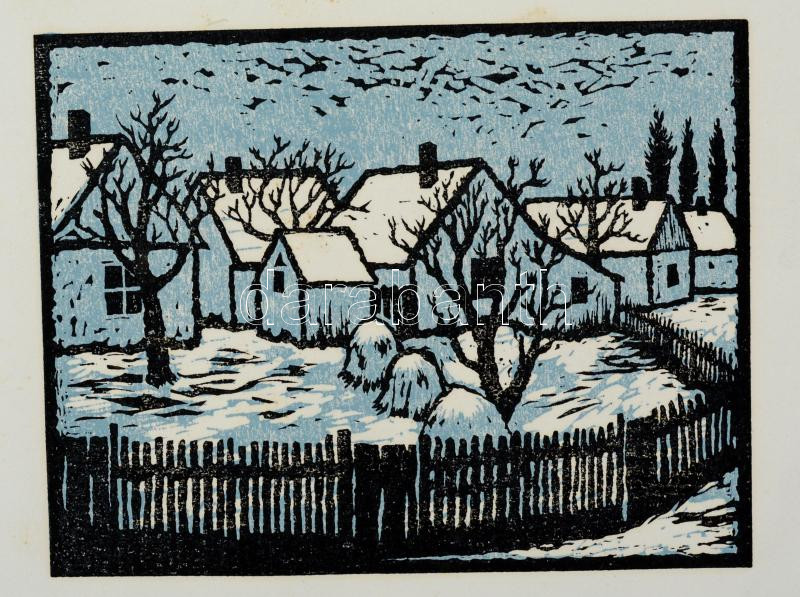 Leírás: Jelzés nélkül: Téli falu. Linó, papír, 14×19 cm