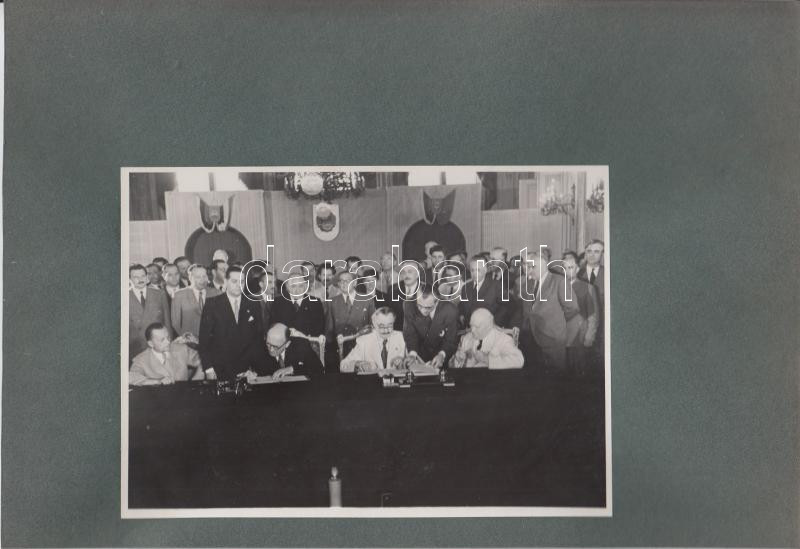 Leírás: 1948 Szofia, Dinnyés Lajos, Rákosi Mátyás, Szakasits Árpád, Dimitrov, kartonra ragasztott, hátoldalon feliratozott fotó, 13x17 cm