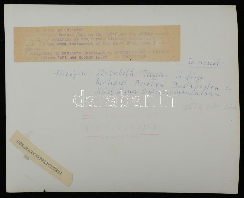 1972 Elisabeth Taylor és Richard Burton Budapesten az Intercontinental... https://www.darabanth.com/hu/282-Gyorsarveres/282.0/Festmeny-mutargy-papirregiseg-egyeb/Foto~31/1972-Elisabeth-Taylor-es-Richard-Burton-Budapesten-az-Intercontinental-szalloban-22x18-cm~II1455654