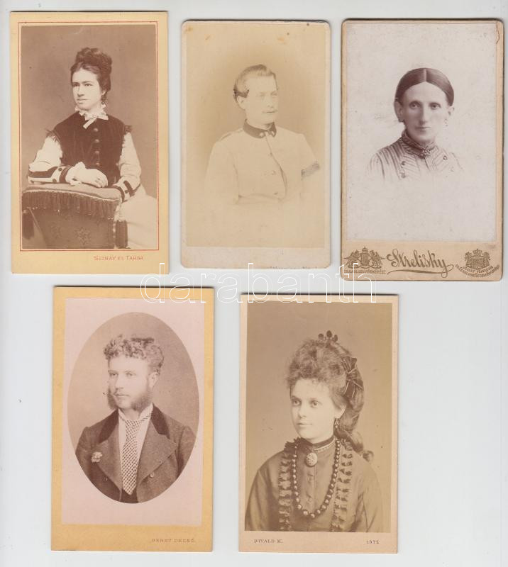 Leírás: cca 1870-1890 Keményhátú műtermi portréfotók különböző műtermekből(Strelisky, Szinay és Társa, Divald K., Wittmann, stb.), 5 db, 10x6 cm