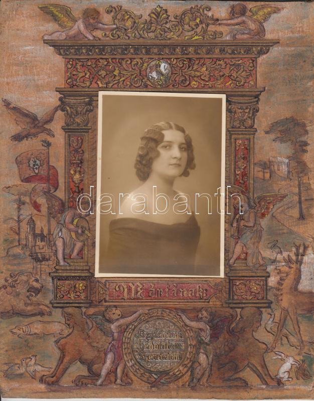 cca 1930 Női portréfotó, díszes festett karton lapon, 26,5×21,5 cm https://www.darabanth.com/hu/282-Gyorsarveres/282.0/Festmeny-mutargy-papirregiseg-egyeb/Foto~31/cca-1930-Noi-portrefoto-diszes-festett-karton-lapon-26-5C39721-5-cm~II1459392