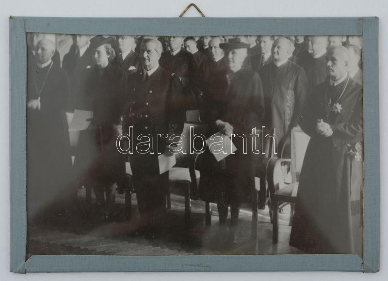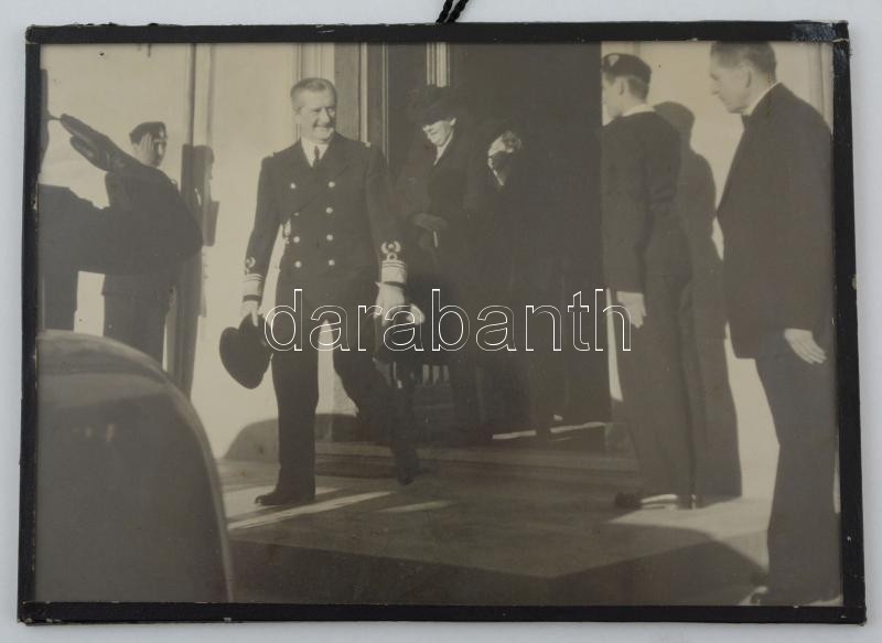 Leírás: cca 1940 Horthy Miklós kormányzó feleségével ünnepségen és leventék gyűrűjében Üvegezett keretben, 13x18 cm