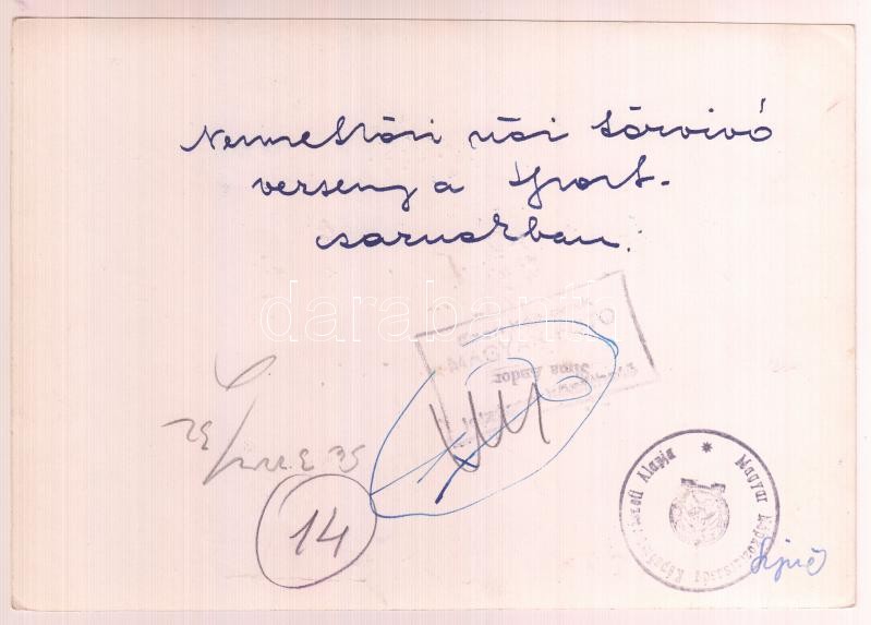 cca 1950 Kardvívó verseny, Nemzetközi női kardvívó verseny a Sportrcsarnokban, a hátán felíratozva, Sima Andor-Magyar Fotó, pecséttel jelzett fotó, 12x18 cm.