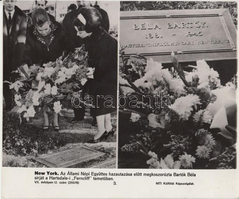 Leírás: cca 1960-1970 New York, Az Állam Népi Együttes hazautazása előtt megkoszorúzta Bartók Béla sírját, MTI sajtófotó, 24x20 cm