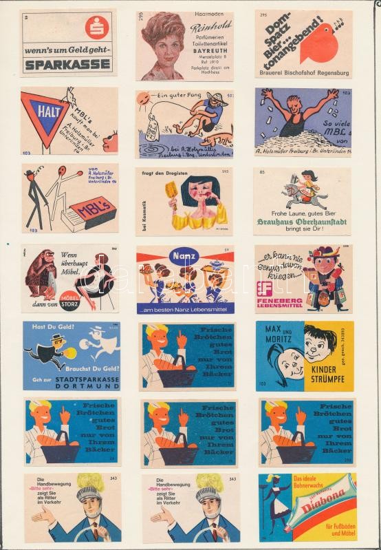 Leírás: 231 db német gyufacímke 11 db kartonlapra ragasztva (Volksbank, sparkasse, drogéria, élelmiszer, kirándulás..stb.)