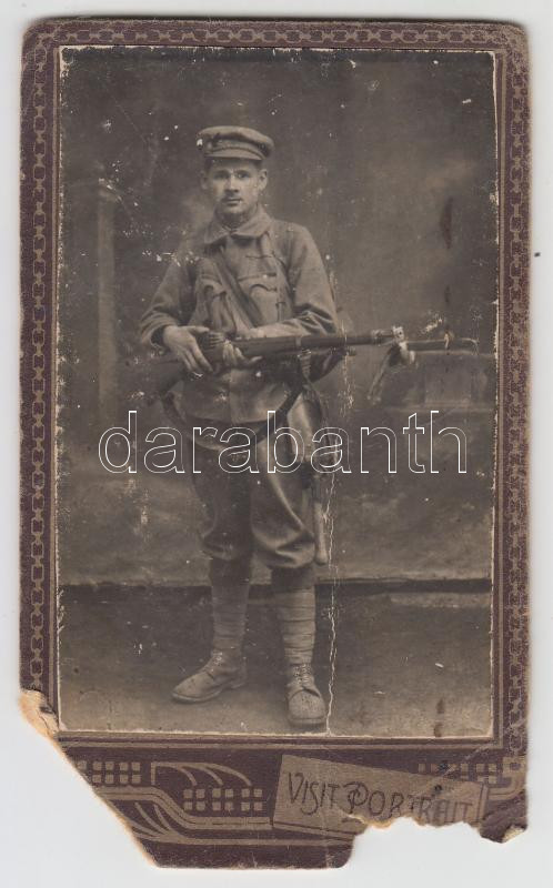 Leírás: 1919 A Tanácsköztársaság katonája fegyverrel, műtermi keményhátú fotó Princz Sándor műterméből, sérült, 11x6,5 cm