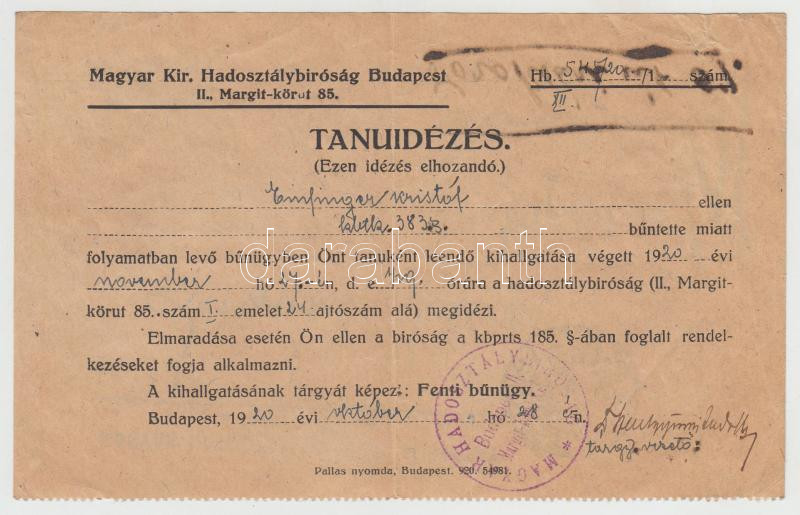 1920 a Magyar Királyi Hadosztálybíróság tanúidézése bűnügy kapcsán https://www.darabanth.com/hu/282-Gyorsarveres/282.0/Festmeny-mutargy-papirregiseg-egyeb/Militaria~5/1920-a-Magyar-Kiralyi-Hadosztalybirosag-tanuidezese-bunugy-kapcsan~II1457869