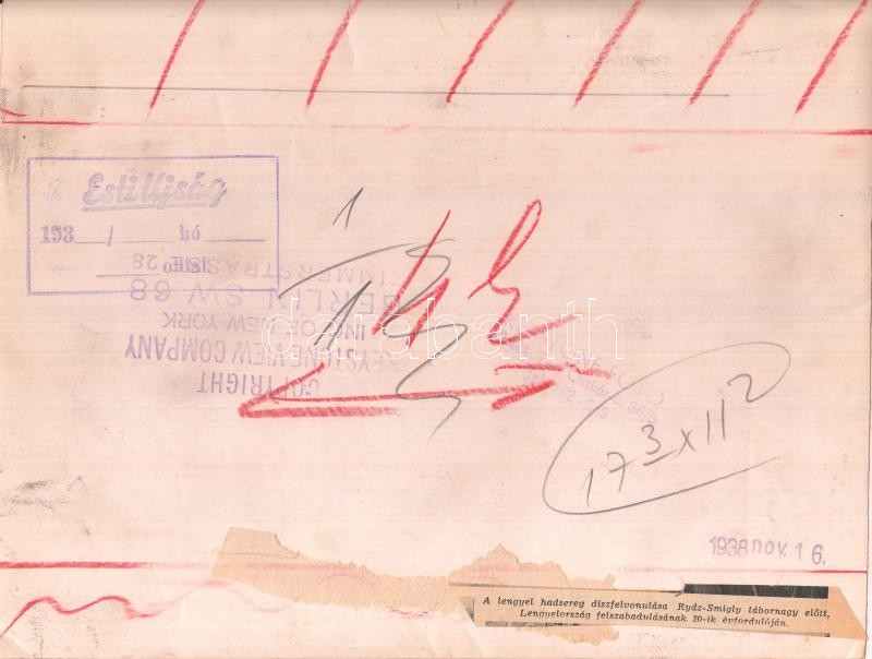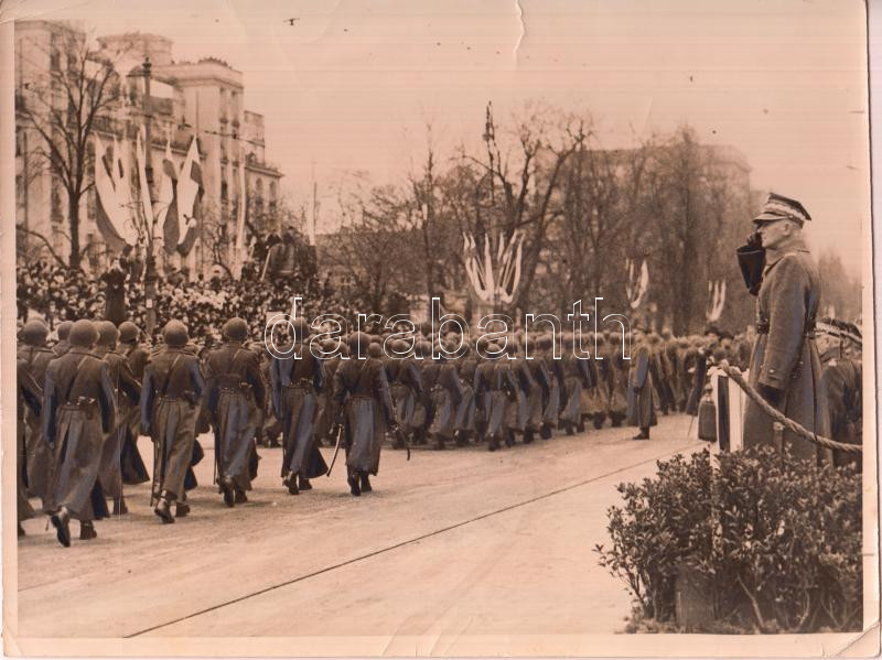 1938 A lengyel hadsereg felvonulása Edward Ryzdz-Smigly (1886-1941) tábornagy előtt, Lengyelország felszabadulásának 20.-ik évfordulójára, Esti Újság sajtófotó, a hátoldalán felíratozva, Keystone Foto, pecséttel jelzett, 18x23 cm. / 1938 The polish army military parade front of Marshal Edward Ryzdz Smigly (1886-1941), Poland release of 20th anninversary, Esti Újság newspaper, pressphoto, with writings in the back, Keystone Foto, signed with stamp, 18x23 cm.