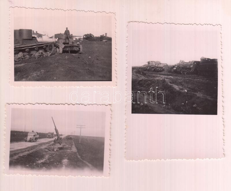 Leírás: 1941 3 db. fotó a keleti frontról, orosz harckocsik Porskurov-nál, szétlőtt orosz vasút és orosz légvédelmi ágyú, 4x6 cm és 8x6 cm közötti méretben.