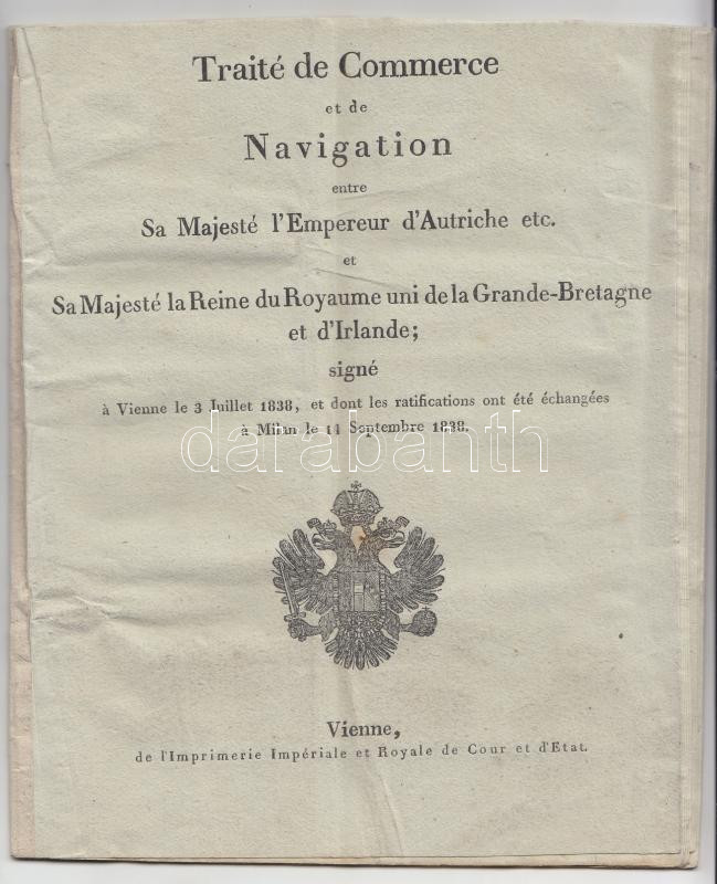 1838 Traité de commerce et de navigation entre sa majesté l'empereur d'Autriche et sa majesté la reine du Royaume Uni de la Grande-Bretagne et d'Irlande. Bécs, l'imprimerie impériale et royale de cour et d'état. Francia, angol, német és részben latin nyelven, 22. p.