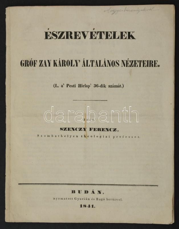 1841 Buda, Észrevételek Gróf Zay Károly általános nézeteire, írta Szen... https://www.darabanth.com/hu/282-Gyorsarveres/282.0/Festmeny-mutargy-papirregiseg-egyeb/Nyomtatvanyok~10/1841-Buda-Eszrevetelek-Grof-Zay-Karoly-altalanos-nezeteire-irta-Szenczy-Ferenc-30p~II1457516