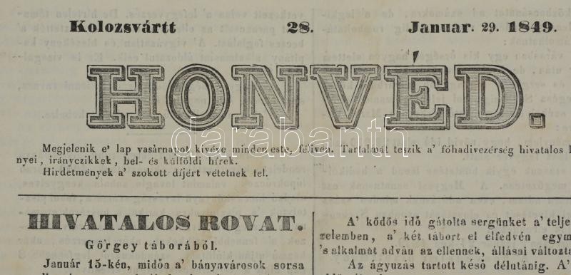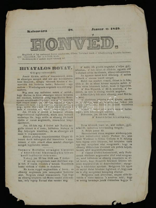 1849 a Honvéd c. kolozsvári újság január 29.-i száma a szabadságharc h... https://www.darabanth.com/hu/282-Gyorsarveres/282.0/Festmeny-mutargy-papirregiseg-egyeb/Nyomtatvanyok~10/1849-a-Honved-c-kolozsvari-ujsag-januar-29-i-szama-a-szabadsagharc-hireivel-csatak-leirC3~II1455595