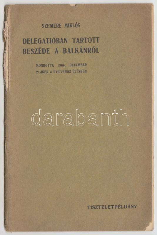 1906 Szemere Miklós Delegatióban tartott beszéde a Balkánról, tisztele... https://www.darabanth.com/hu/282-Gyorsarveres/282.0/Festmeny-mutargy-papirregiseg-egyeb/Nyomtatvanyok~10/1906-Szemere-Miklos-Delegatioban-tartott-beszede-a-Balkanrol-tiszteletpeldany-8p~II1457253