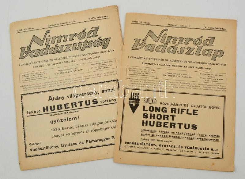 Leírás: 1936-1943 a Nimród vadászlap 2 lapszáma, érdekes írásokkal