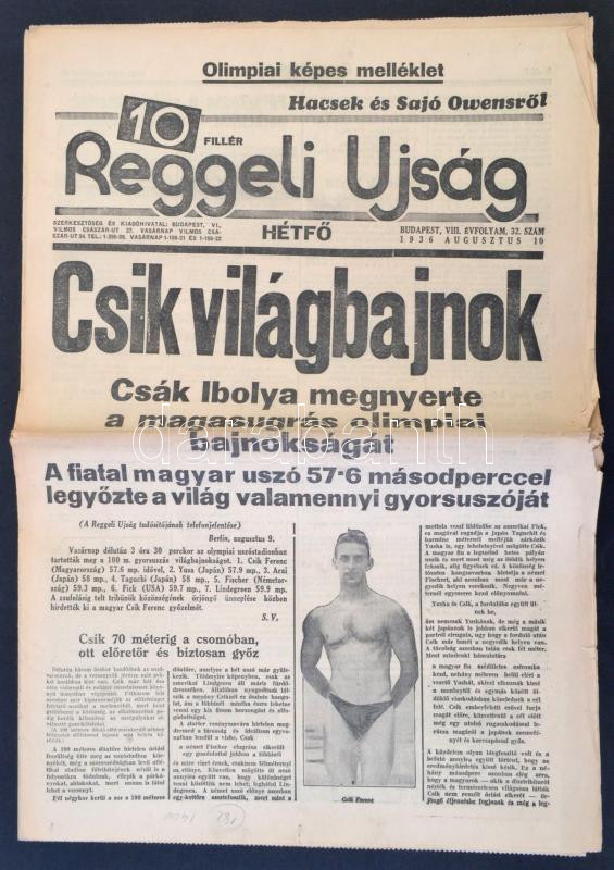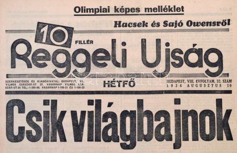 Leírás: 1936 A Reggeli Újság VIII. évfolyamának 32. száma, címlapon Csák Ibolya olimpiai győzelmével